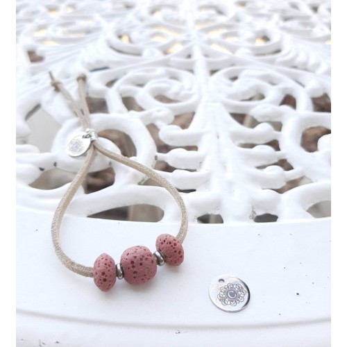 Bracelet sur cordon beige pâle en suédine avec insertions de pièces en acier inoxydable et de pierres de lave vieux roses servant à diffuser vos huiles essentielles préférées!
