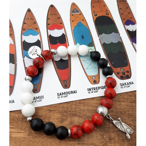 Bracelet sur élastique résistant fait de pierres semi-précieuses 8 mm : jade blanc, onyx et pierres rouges