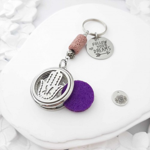 - Porte-clés incluant feutre mauve pour y diffuser quelques gouttes de vos huiles essentielles